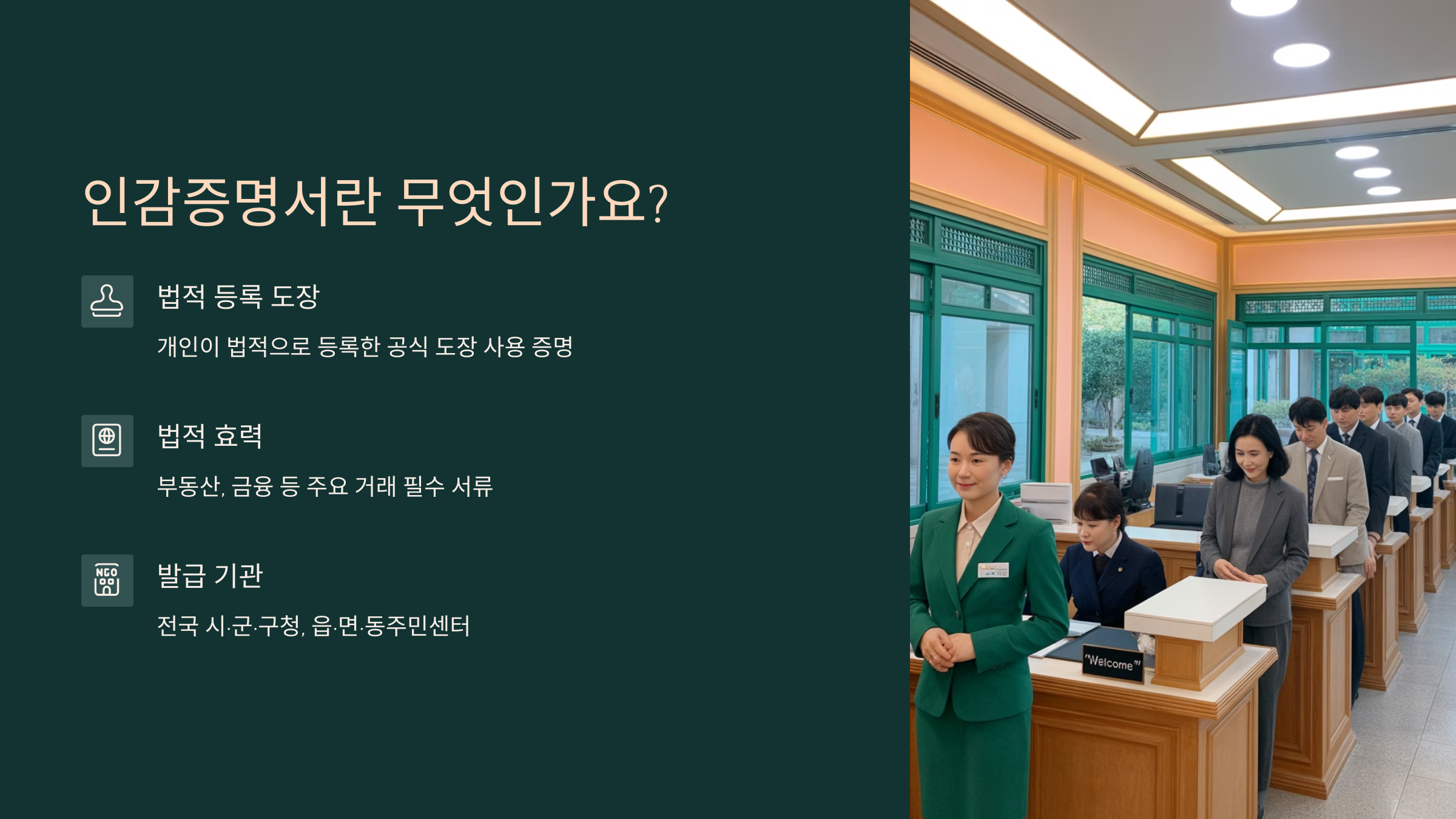 인감증명서란 개인이 본인의 인감을 등록한 후, 그 인감이 본인의 것임을 증명해주는 공식 문서예요. 인감이란 쉽게 말해 '법적 효력을 가진 도장'이라고 생각하면 돼요. 일반 도장과 달리 **등록 절차를 거친 인감**만이 인감증명서와 함께 사용할 수 있답니다.