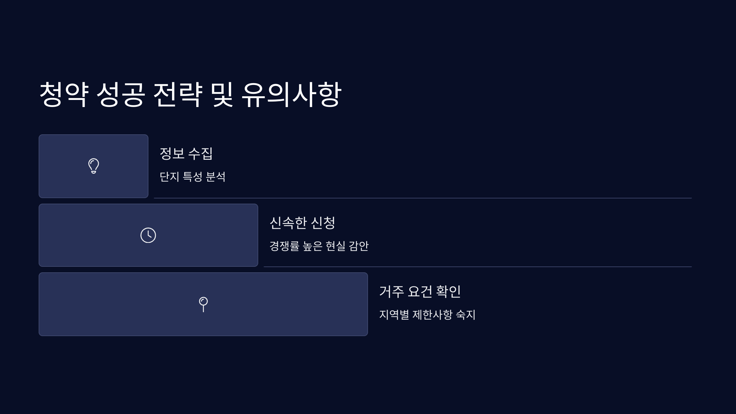 | 전략 | 공고문 확인, 일정 파악, 경쟁률 분석, 자금 준비 |