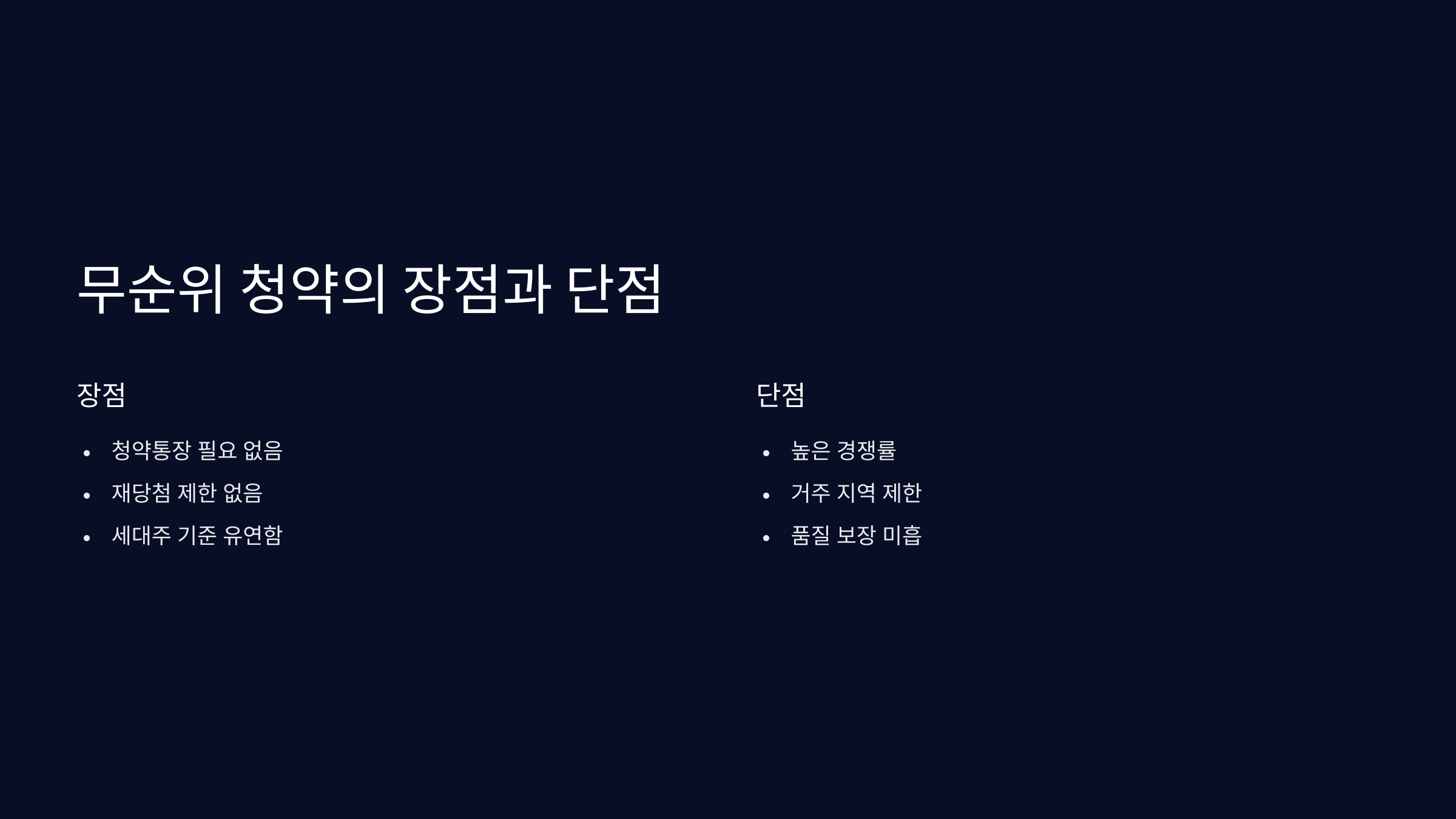 | 단점 | 잔여 물량 한계, 계약 포기 시 불이익, 자금 계획 필요 |