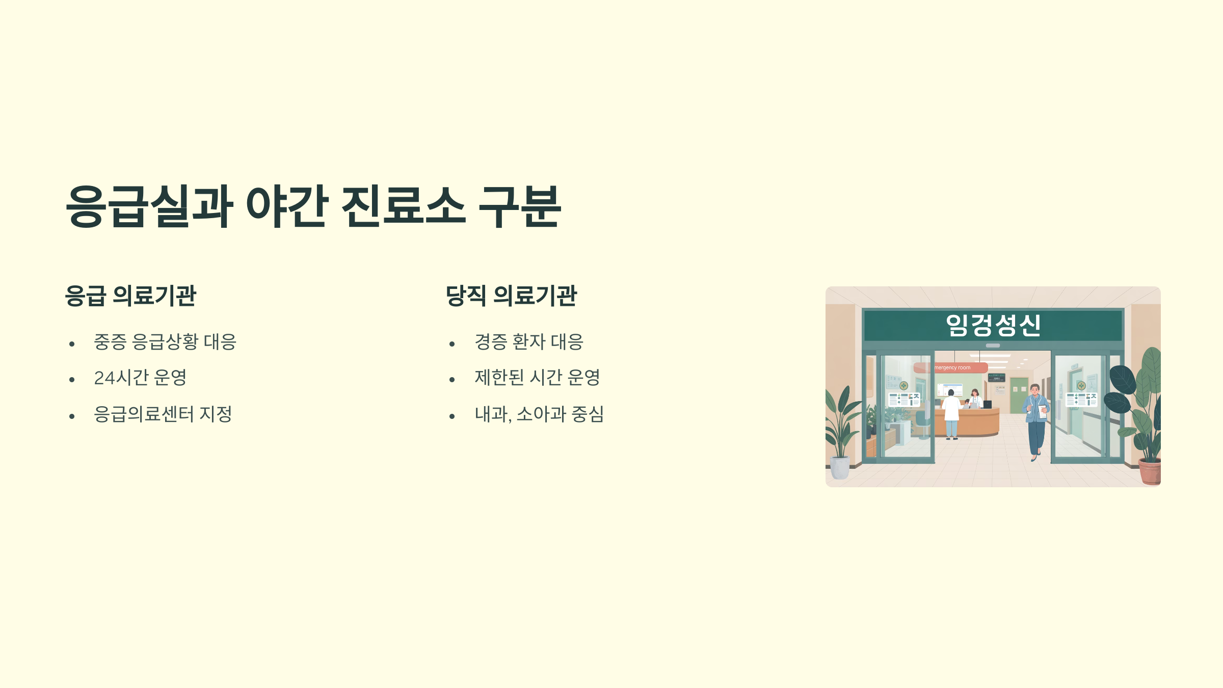 응급실은 24시간 운영되며 생명이 위급한 상황에서 방문하는 곳이에요. 반면 야간 진료소나 일요일 진료 병원은 응급은 아니지만 당장 진료가 필요한 환자를 위한 시설이랍니다.